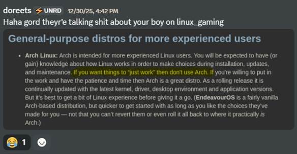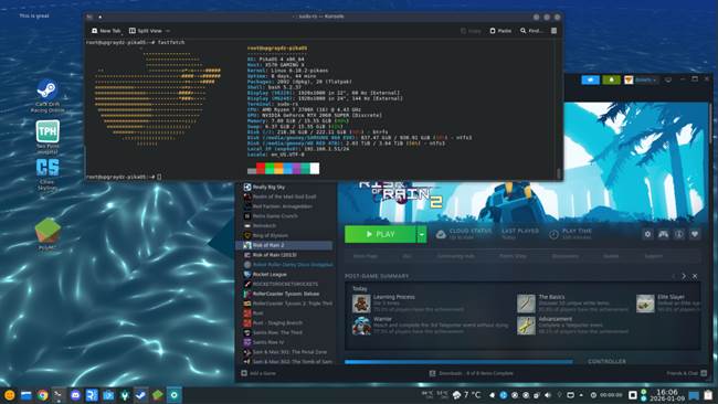 Me: i dunno gord this PikaOS is pretty fuckin dope so far. It has this wizard on first boot that prompts you to install codecs, install other gaming stuff packaged into a "PikaOS gaming utilities"... Steam, Lutris, goverlay, wine, bottles, blah blah... everything's workin super doopey fast so far. And I'm running off a USB dock lmfao. The drive isn't even plugged in with SATA.